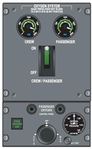Immediately aft of the OXYGEN SYSTEM panel section is a panel labelled PASSENGER OXYGEN CONTROL PANEL. The panel contains a gage indicating the pressure of the oxygen supplied to the passenger cabin, an annunciator that illuminates the text label PASS OXYGEN ON when the system is in use and a rotary mode control switch to select the type of operation of the passenger oxygen system. The switch has three positions: